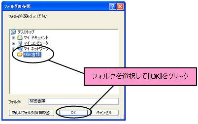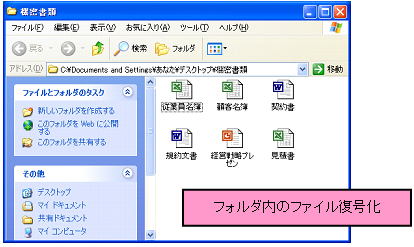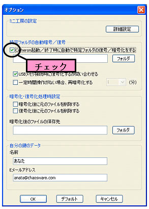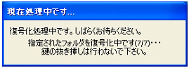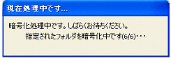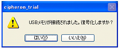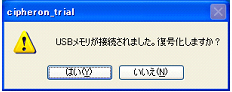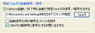 3−3 特定フォルダを自動的に暗号化/復号化する 『CIPHERON』起動時や終了時に、指定したフォルダを自動的に暗号化/復号化することができます。指定したフォルダに重要なファイルを保存しておくことで、『CIPHERON』が起動していないとき、あるいは鍵管理しているUSBメモリなどの外部記憶装置が接続されていないときは、常に暗号化されている状態を保っています。 自動暗号化/復号化が開始される条件は、以下の通りです。 ☆自動暗号化 ソフトが起動しているときに、鍵が入っているUSBメモリが抜かれた ソフトを終了した 一定時間コンピュータの操作が行われなかった(1,5,10分,設定無しから選択) ☆自動復号化 ソフトが起動しているときに、鍵が入っているUSBメモリが接続された 鍵が入っているUSBメモリが接続された状態でソフトを起動した 特定フォルダの自動暗号化/復号化はオプションで設定します。 ![]() ![]() “特定フォルダの自動暗号/復号”にチェックを入れます。次に[フォルダ]をクリックして、自動的に暗号化/復号化したいフォルダを選択します。 ![]() 選択をしたら[OK]をクリックしてください。 次に、“USBメモリ接続時に復号化するか問い合わせる”、“一定時間操作がない場合、再暗号化する”の設定を行います。 ![]() “USBメモリ接続時に復号化するか問い合わせる”にチェックを入れると、USBメモリ接続時に、以下のようなダイアログが表示されるようになります。 ![]() [はい]をクリックすると、フォルダの自動復号が開始されます。[いいえ]をクリックすると、フォルダは自動的には復号化されません。初期設定では機能は、オンです。 “一定時間操作がない場合、再暗号化する”にチェックを入れると、コンピュータの操作が一定時間行われない際に、自動的にフォルダが暗号化され、ソフトが終了します。 時間は1分間、5分間、10分間のいずれかから選択してください。この機能をオフにする場合は、チェックを外してください。初期設定では、機能はオンです。 <自動暗号化> ソフトを起動中に、鍵管理フォルダのあるUSBメモリをコンピュータから抜く、またはソフトを終了する、または一定時間コンピュータの操作を行わないと、画面の右下に、以下のようなダイアログが表示され、指定したフォルダの暗号化が開始されます。 ![]() このダイアログが画面から消えた時点で暗号化はすべて完了です。指定したフォルダ内のファイルがすべて暗号化されているか確認してください。 ![]() <自動復号化> ソフトを起動したとき、あるいはソフトが起動しているときに鍵管理フォルダのあるUSBメモリをコンピュータに挿入すると、復号化を行うかどうかのダイアログが表示されます。 ※フォルダ内のファイル数が多い場合、復号化に時間がかかることがありますので、状況に応じて選択してください。 ![]() [はい]をクリックすると、以下のようなダイアログが表示され、指定したフォルダの自動復号化が開始されます。 ![]() ※復号化中は絶対にUSBメモリを抜かないでください。メモリやファイルが壊れる場合があります。 このダイアログが消えて、『CIPHERON』の起動画面が表示された時点で復号化は終了です。指定したフォルダ内のファイルがすべて復号化されていることを確認してください。 ![]() 復号化を行うかどうかのダイアログで[いいえ]をクリックすると、復号化は行われません。すぐに『CIPHERON』の起動画面が表示されます。 |